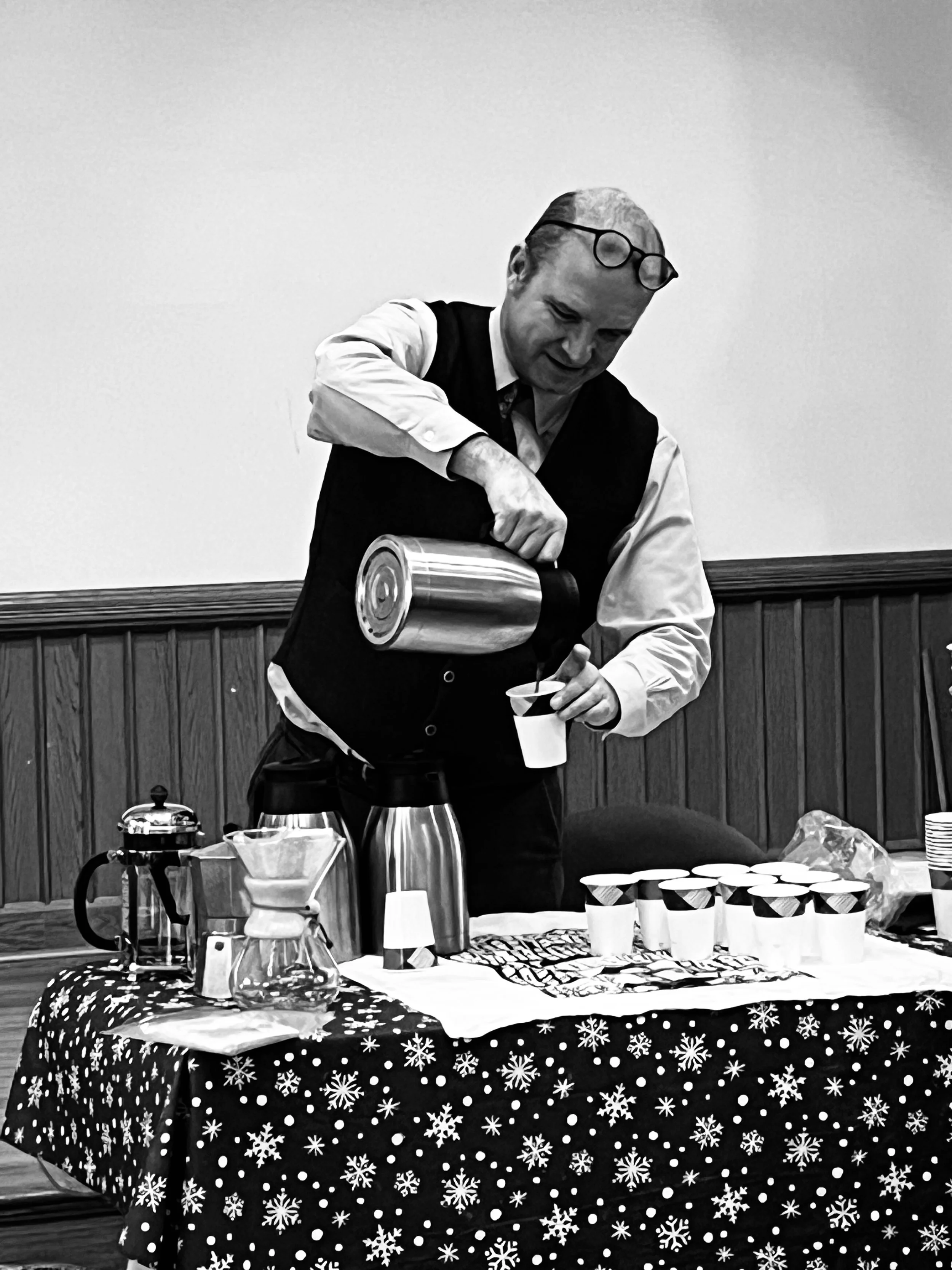 Note: In past years I’ve brewed the coffee on site, which was great but messy and required a kitchenette and trash can. Now I bring pre-brewed coffee in airpots. But let me know if you want me to do a brew demonstration.